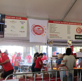 I know you're all waiting for the food. We were too. The queues! (Joke.) The food stalls are set up by different Greek community groups, each with their own specialties. For example, the Kalymnian Brotherhood do octopus. A colleague told me that Greek builders and concreters in Darwin have a special cement mixer that they use to tenderise the 3 tons of octopus they barbecue for the festival. And look, Darwin Olympic and Hellenic AC are still competing in the souva and yiros stakes.
