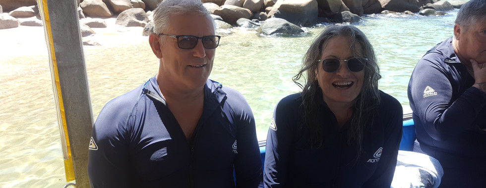 The Great Barrier Reef is further east (a couple of hours out to sea) but these islands have their own fringing reef. Snorkelling around Maggie doesn't reach the heights of the GBR but the fringing reef is easily accessible and snorkelling is pleasant and comfortable. Here we are in the obligatory (OHS) stingersuits, plus the recommended pool noodle.